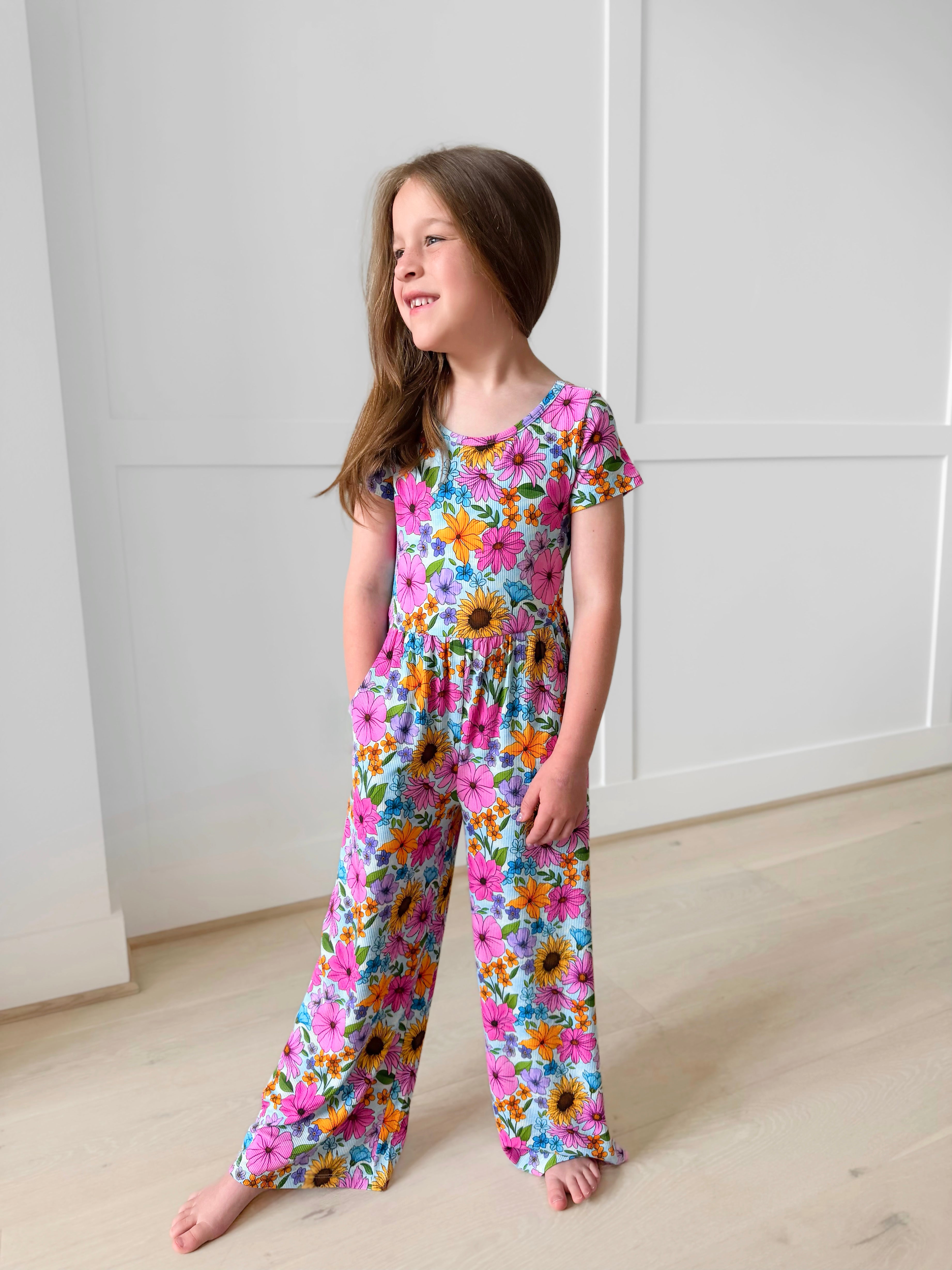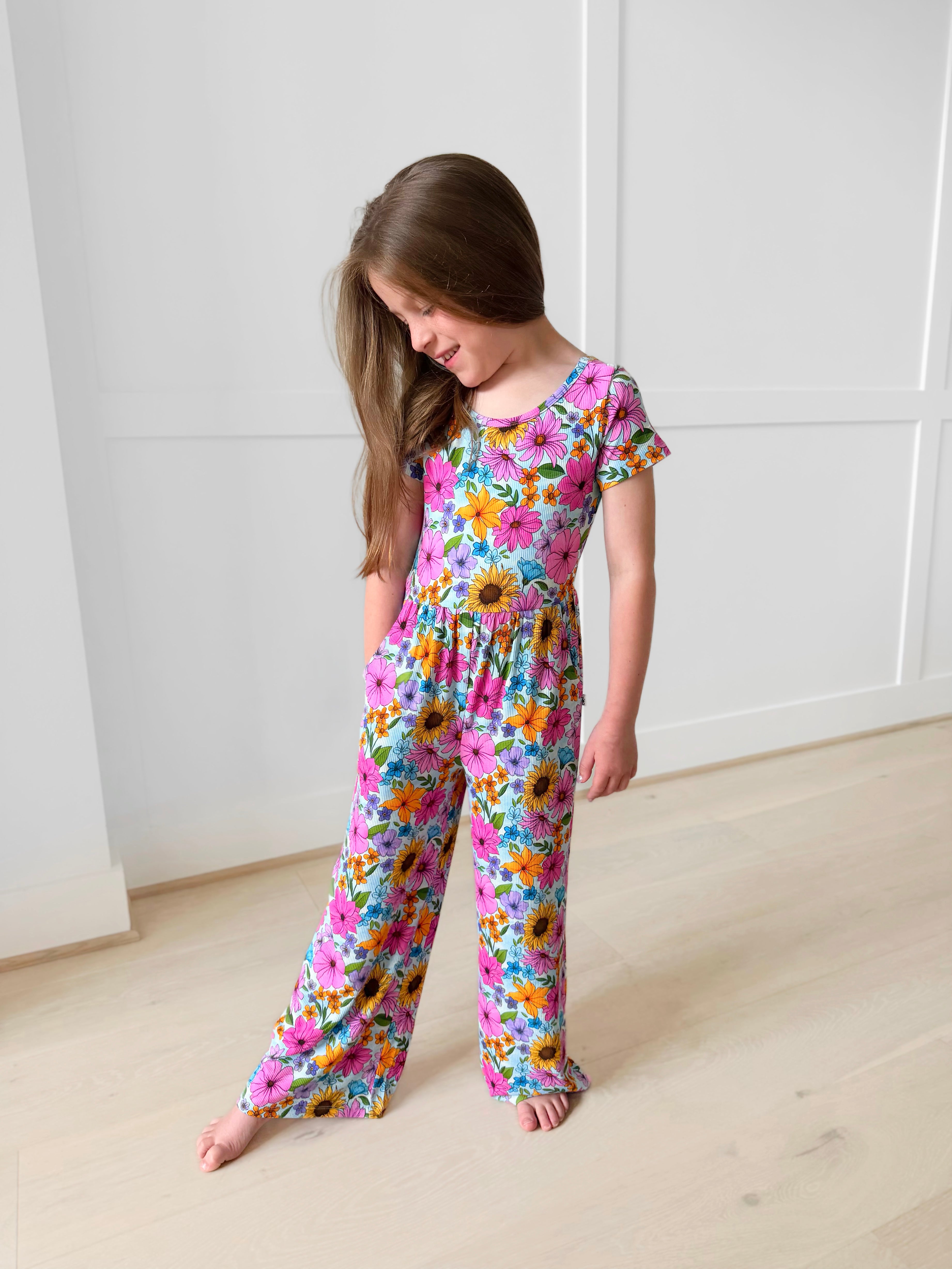 Bamboo RIBBED LET IT BLOOM SHORT SLEEVE FULL LENGTH POCKET ROMPER